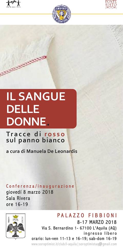 In occasione delle celebrazioni per la Giornata internazionale della Donna 2018 il Soroptimist Club L’Aquila – A global voice for women, con il patrocinio del Comune dell’Aquila e del MuBAQ- Museo dei Bambini e il supporto tecnico di Edizioni Ponte Sisto, presenta la mostra Il sangue delle donne. Tracce di rosso sul panno bianco nella Sala Esposizioni di Palazzo Fibbioni dell’Aquila con le opere delle artiste internazionali: